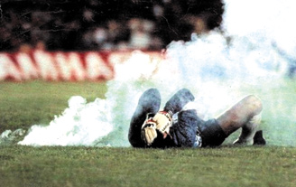 Silbando, la luz de bengala cayó sobre la cancha, a escasos metros de «El Cóndor». Rojas se llevó las manos a la cara y el juego se interrumpió. Era el minuto 68 con 44 segundos de juego. «El Cóndor» estaba herido, en la grama frente al arco. El humo de la pólvora cubría en una nube de confusión el incidente...